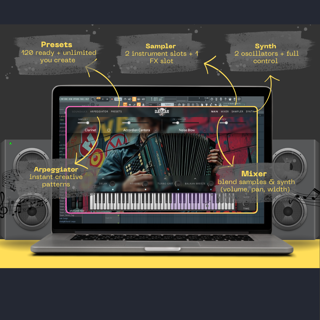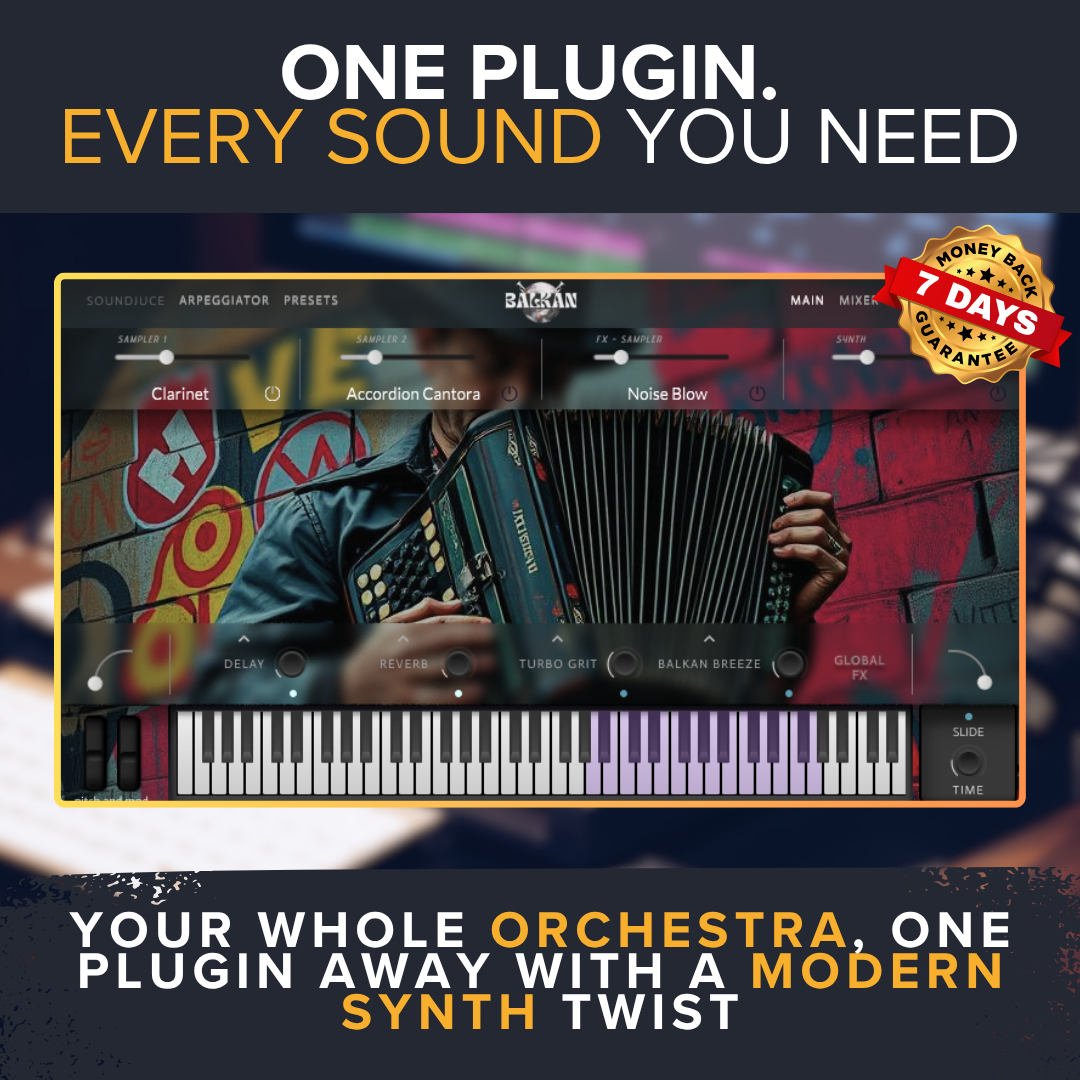 Answer: You get the BALKAN plugin with 120+ mix-ready presets — acoustic, ethnic, and modern sounds — delivered instantly to your email. Install it on any Mac or Windows computer and start creating unique beats immediately.