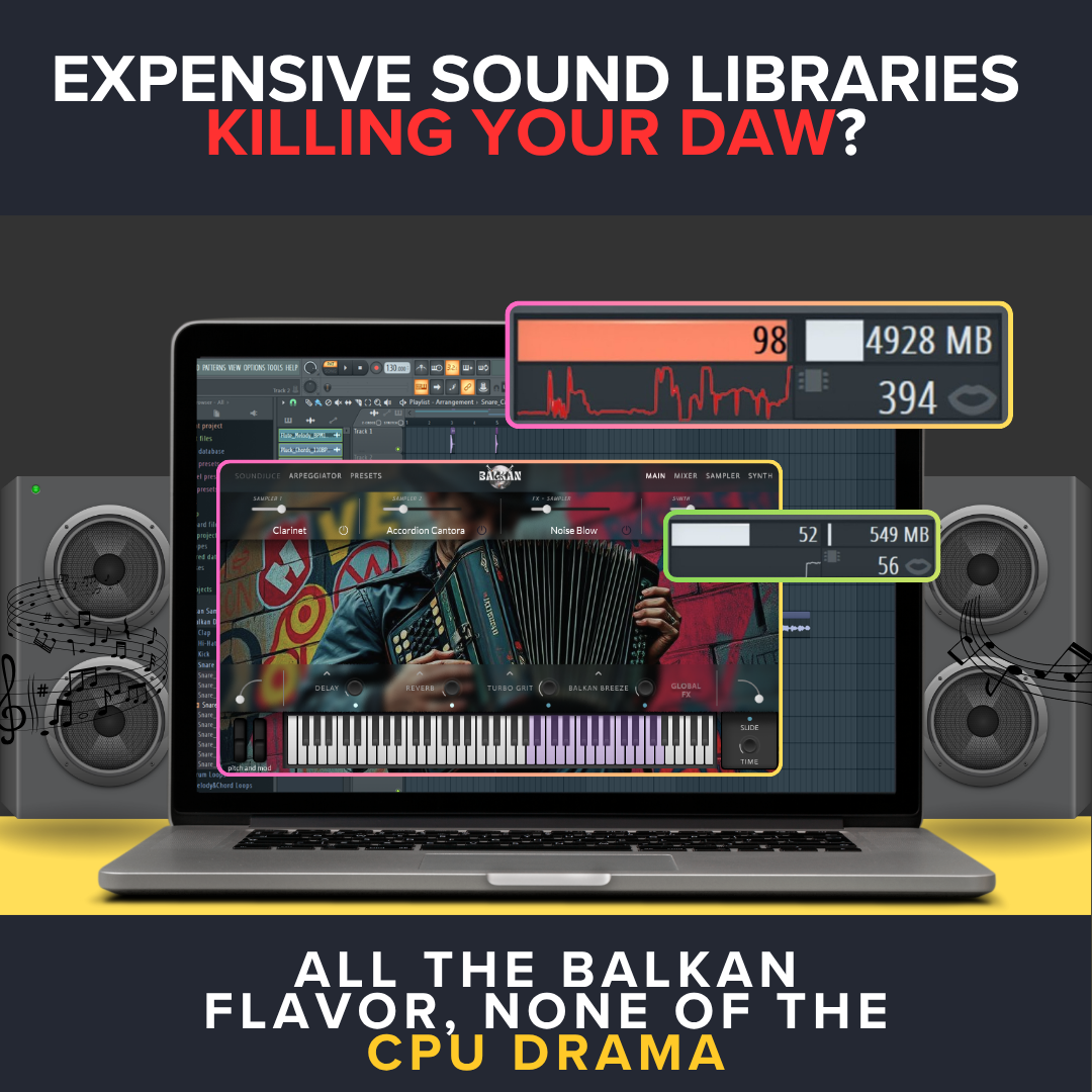 Answer: Nope. BALKAN is all-in-one — 120+ mix-ready presets, acoustic, ethnic, and modern sounds. No extra plugins required, no lag, no CPU issues.