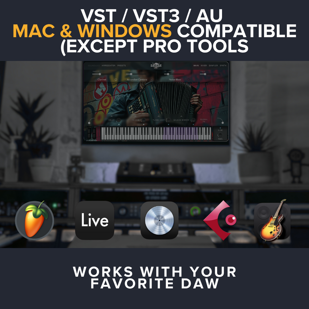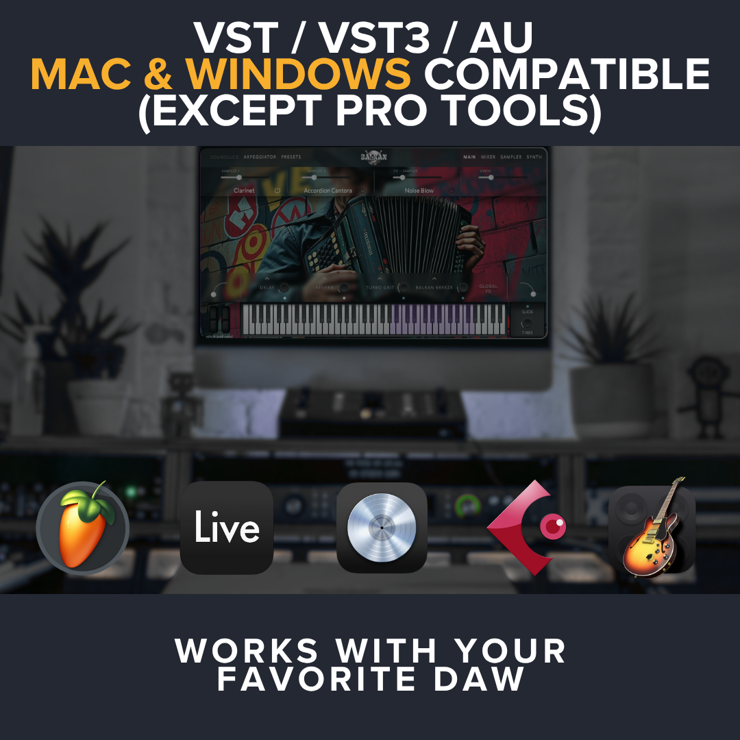 Answer: Yes! BALKAN works flawlessly with FL Studio, Ableton Live, Logic Pro, Cubase, Studio One, Reaper, Reason, Garage Band and Bitwig. It supports VST, VST3, and AU formats on both Mac and Windows. (Pro Tools not supported.)
